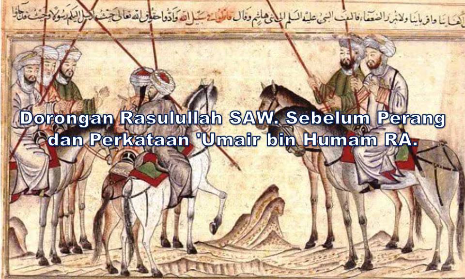 Maka berkatalah ‘Umair bin Humam RA. dari Kabilah Bani Salimah yang ketika itu sedang memegang beberapa butir kurma dan memakannya, “Bagus! Bagus! Pemisah antara aku dan waktu memasuki Surga hanyalah terbunuh oleh pasukan musyrik.”